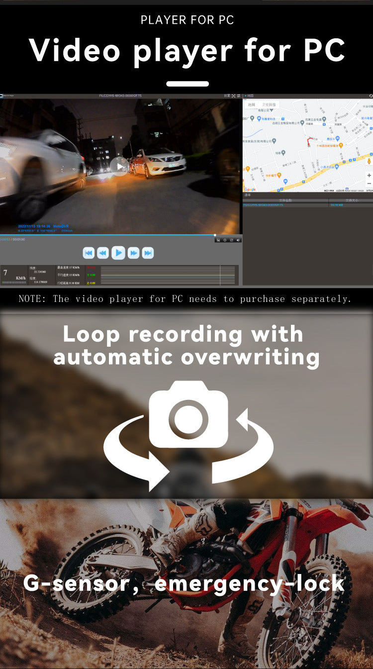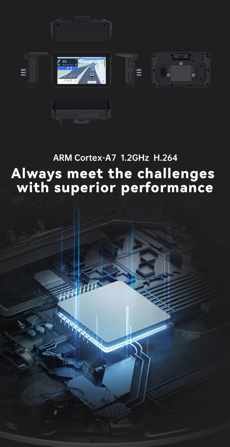 The device supports wide range power inputs (6.5V to 30V via motorcycle battery, or 5V/2.5A+ via USB).